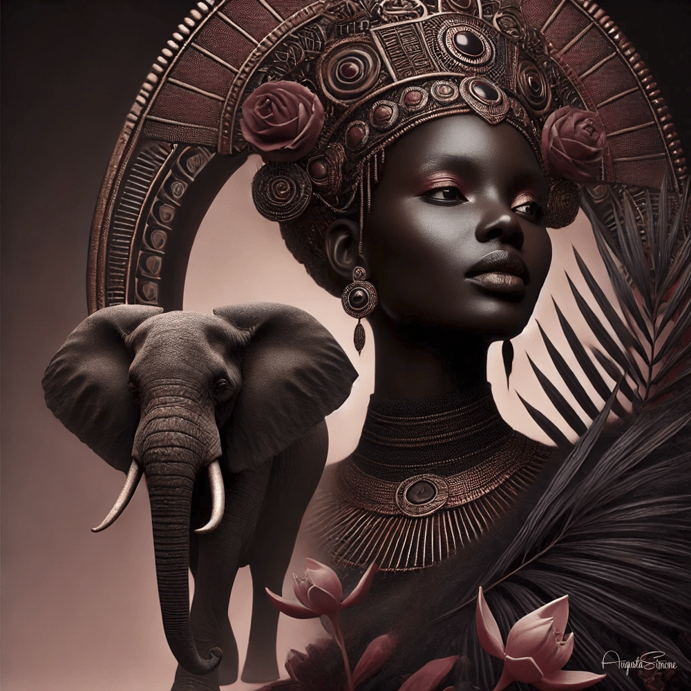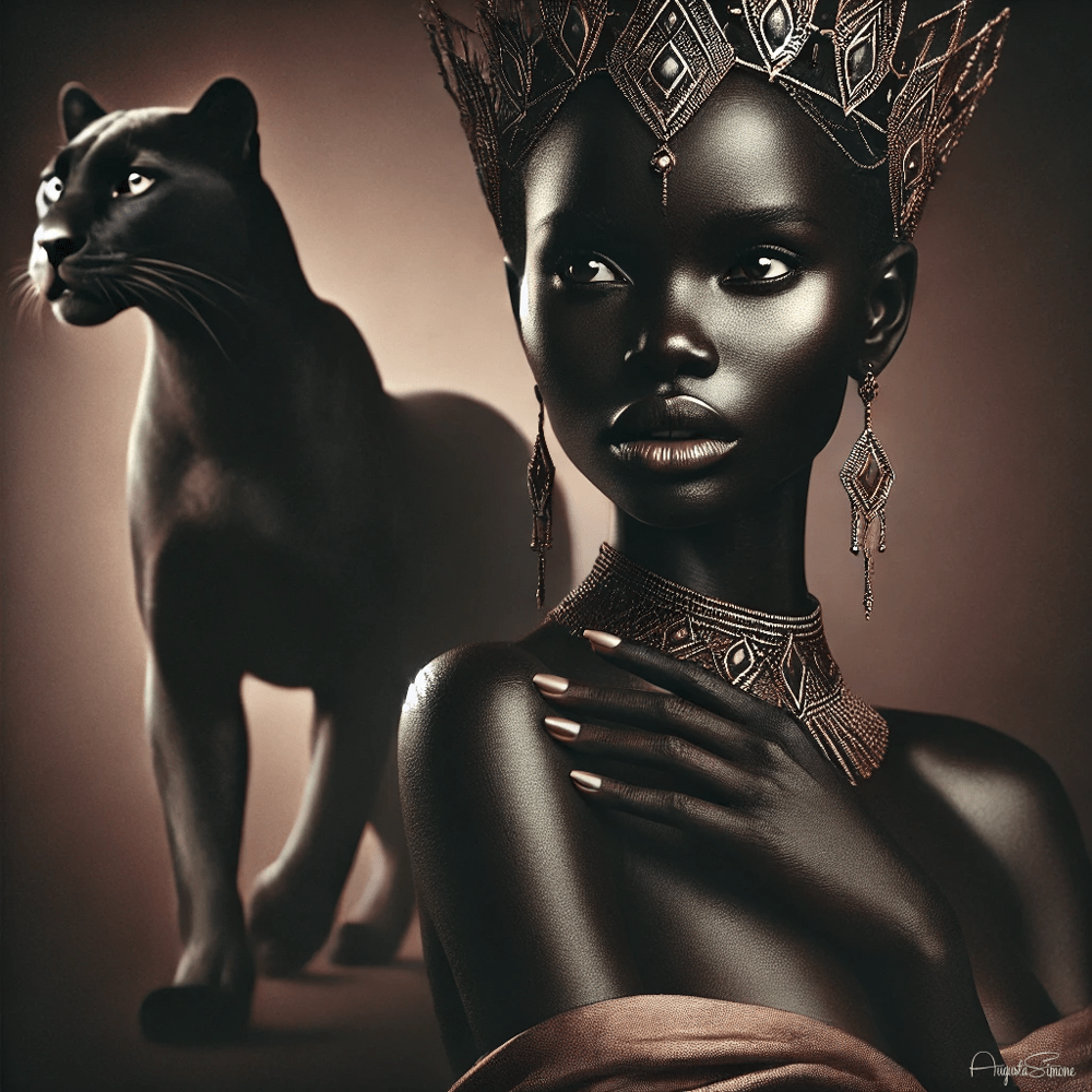 Each piece in the collection pairs a striking Nubian queen with her spirit animal—a lioness, a panther, or an elephant—each symbolizing unique qualities of power, wisdom, and resilience. The lioness emerges as a figure of unshakable leadership, the panther embodies elegance cloaked in mystery, and the elephant offers a profound sense of wisdom and groundedness. These majestic animals are not mere companions, but rather extensions of the queens’ spirits, merging the physical and the metaphysical in a way that encourages viewers to reflect on their own source of strength.