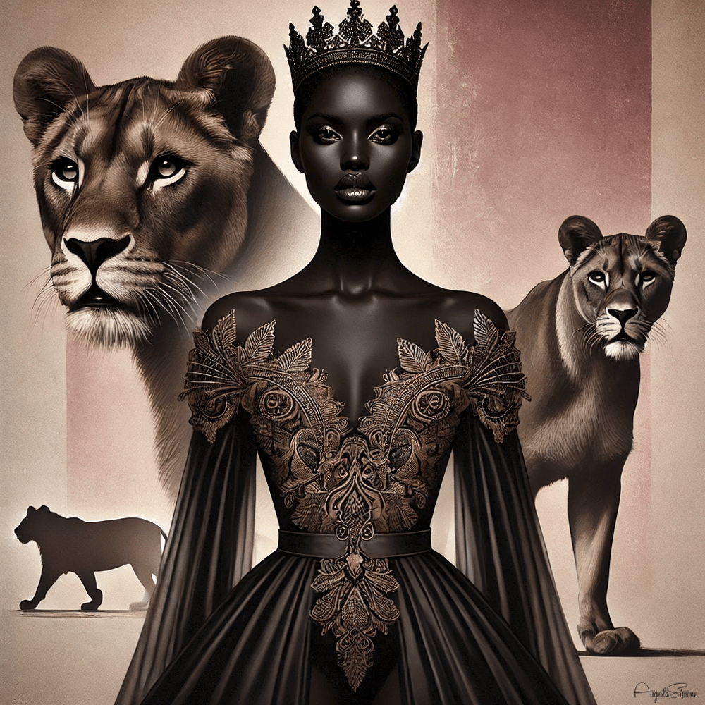 This collection embodies more than just regal imagery; it is a celebration of the divine within us all. It speaks to the need for upliftment—both personal and collective. The queens and their spirit animals, emerging from shadow into light, call us to honor our roots, embrace our inner power, and rise with dignity and purpose. It is a poignant reminder that true majesty lies not in what we wear, but in the strength of the spirit that guides us forward.